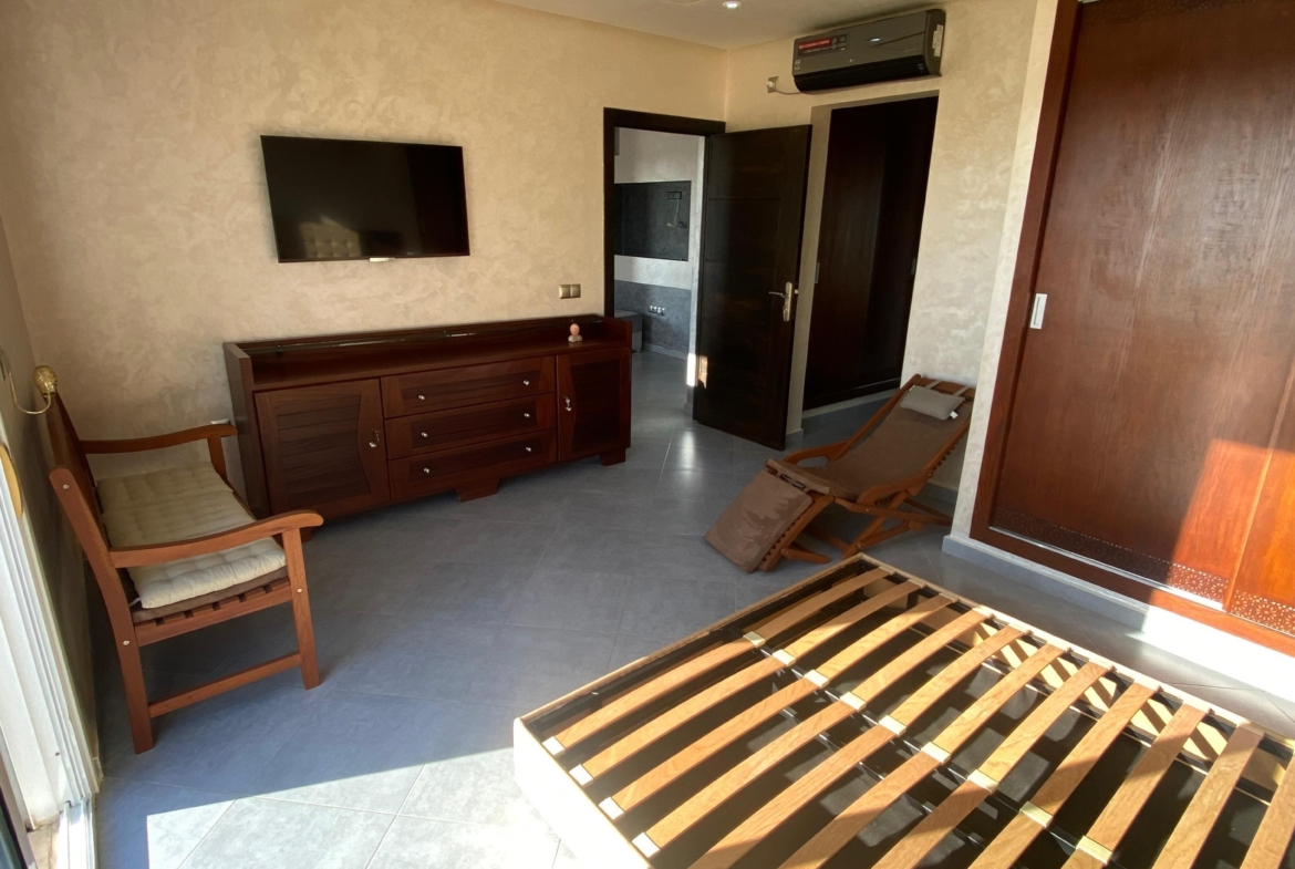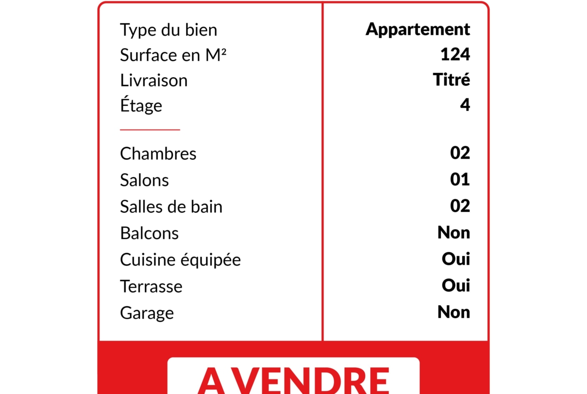 Situé au 4ᵉ étage d’un immeuble sans ascenseur, au sein d’une résidence fermée et sécurisée avec piscine, il se compose de 2 chambres, dont une suite parentale avec dressing et salle de bain, un salon, une cuisine entièrement équipée, un W.C indépendant et d’une pré-installation pour la climatisation. Bien qu’il ne dispose pas de place de parking.