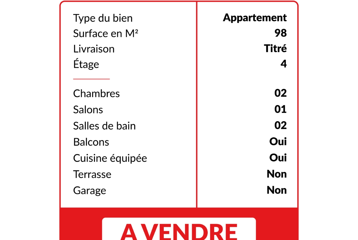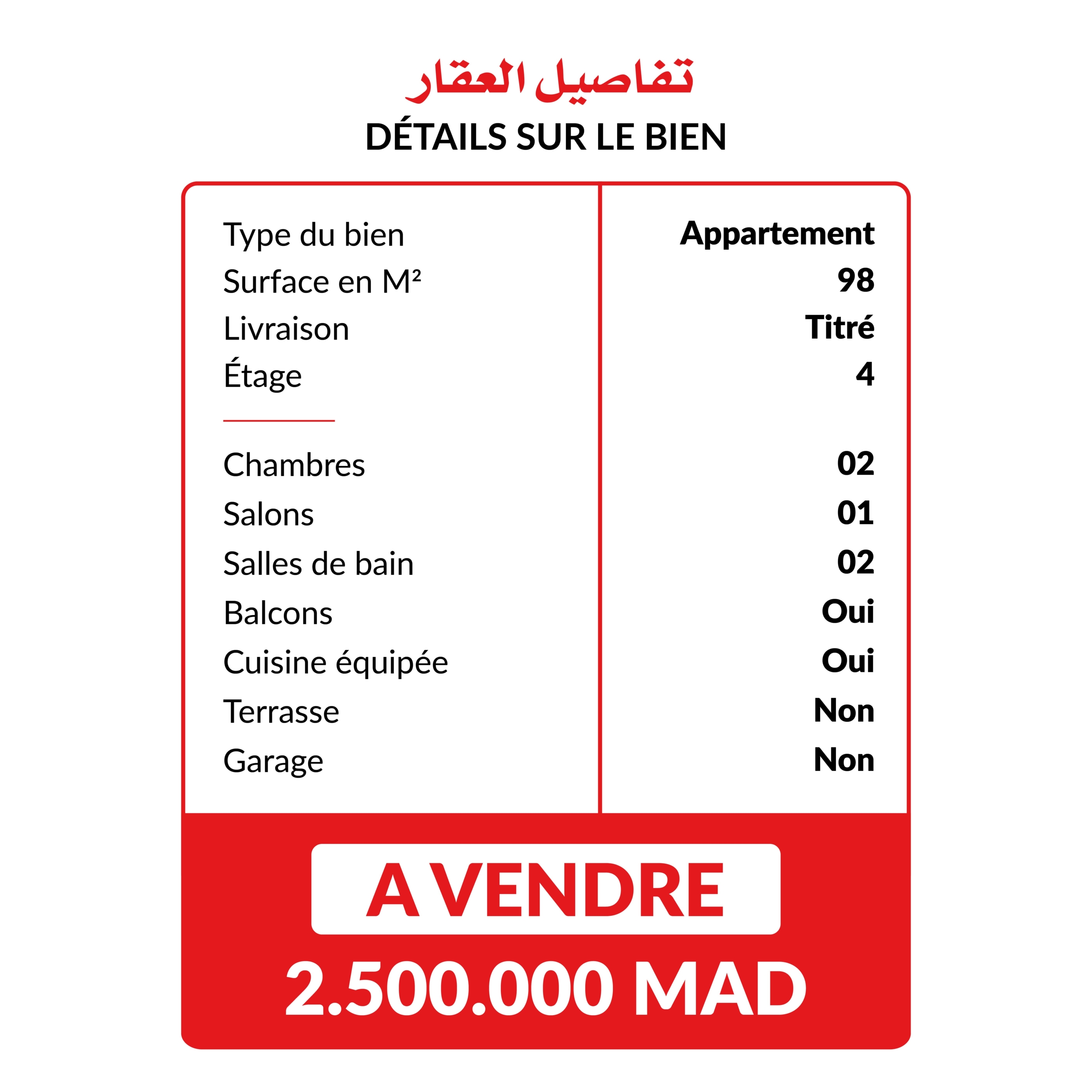 Appartement meublé de 98 m² situé au 4ᵉ étage d’une résidence bien entretenue, il se compose de 2 chambres, salle de bain, salon avec balcon, une cuisine équipée et un W.C.