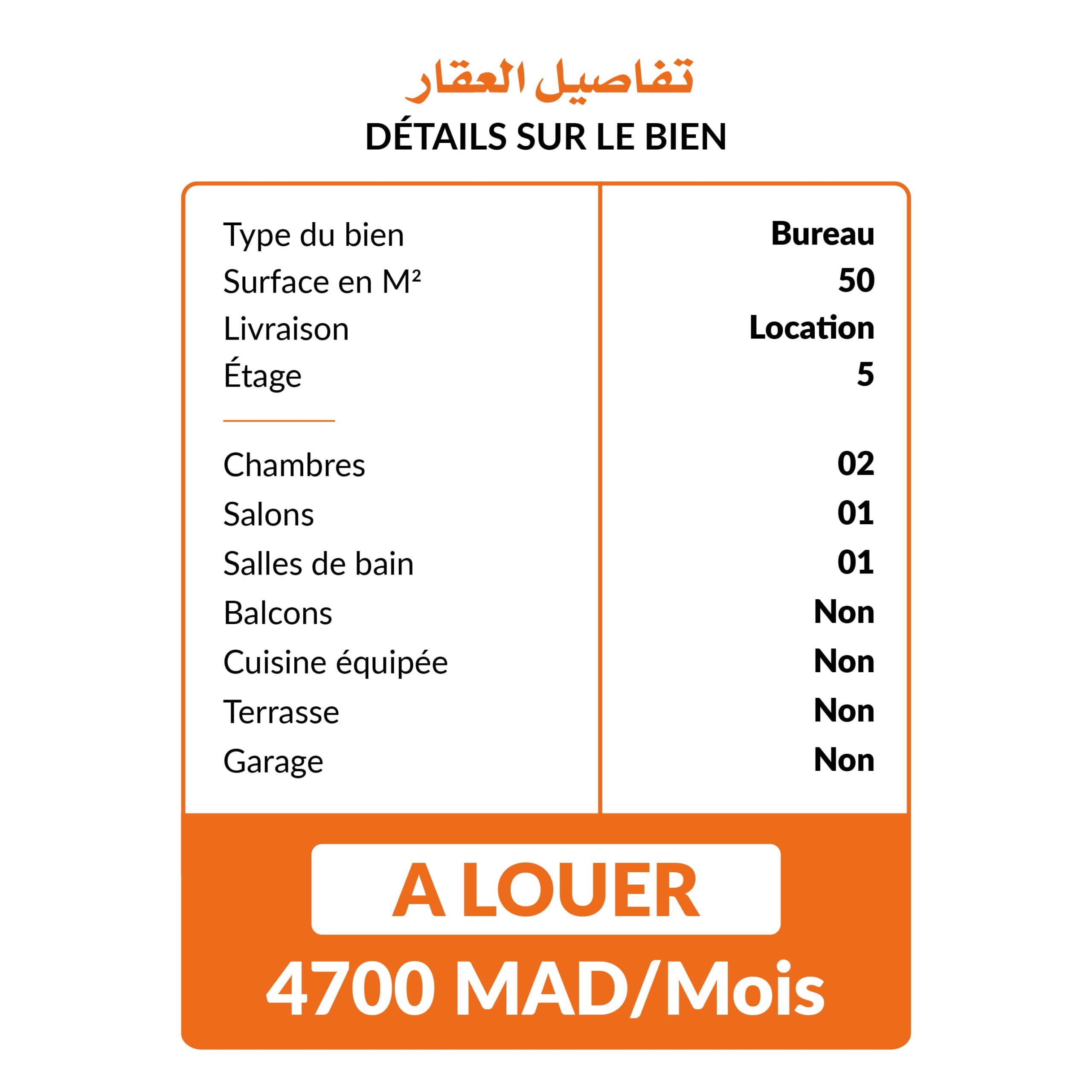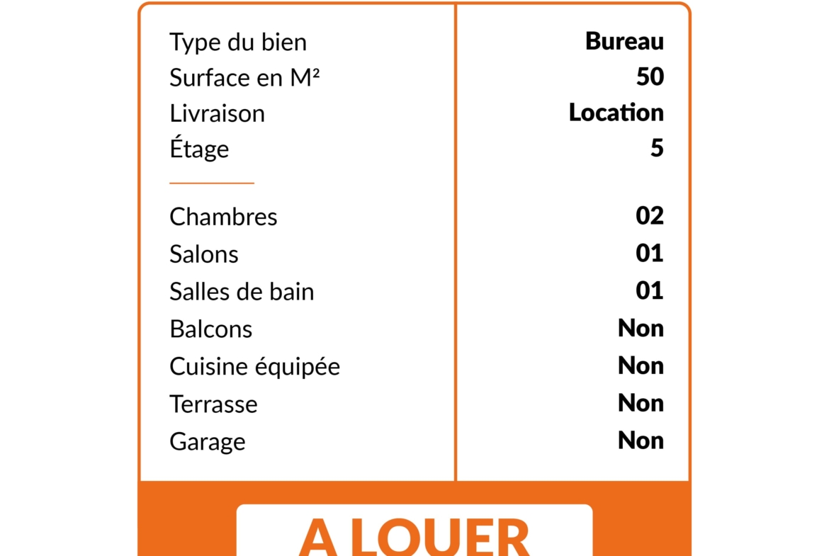 Bureau vide de 50m² situé au 5è étage d’un immeuble bien entretenu. Il se compose de : 2 pièces 1 salle d’attente 1 salle de bain 1 cuisine Sans parking