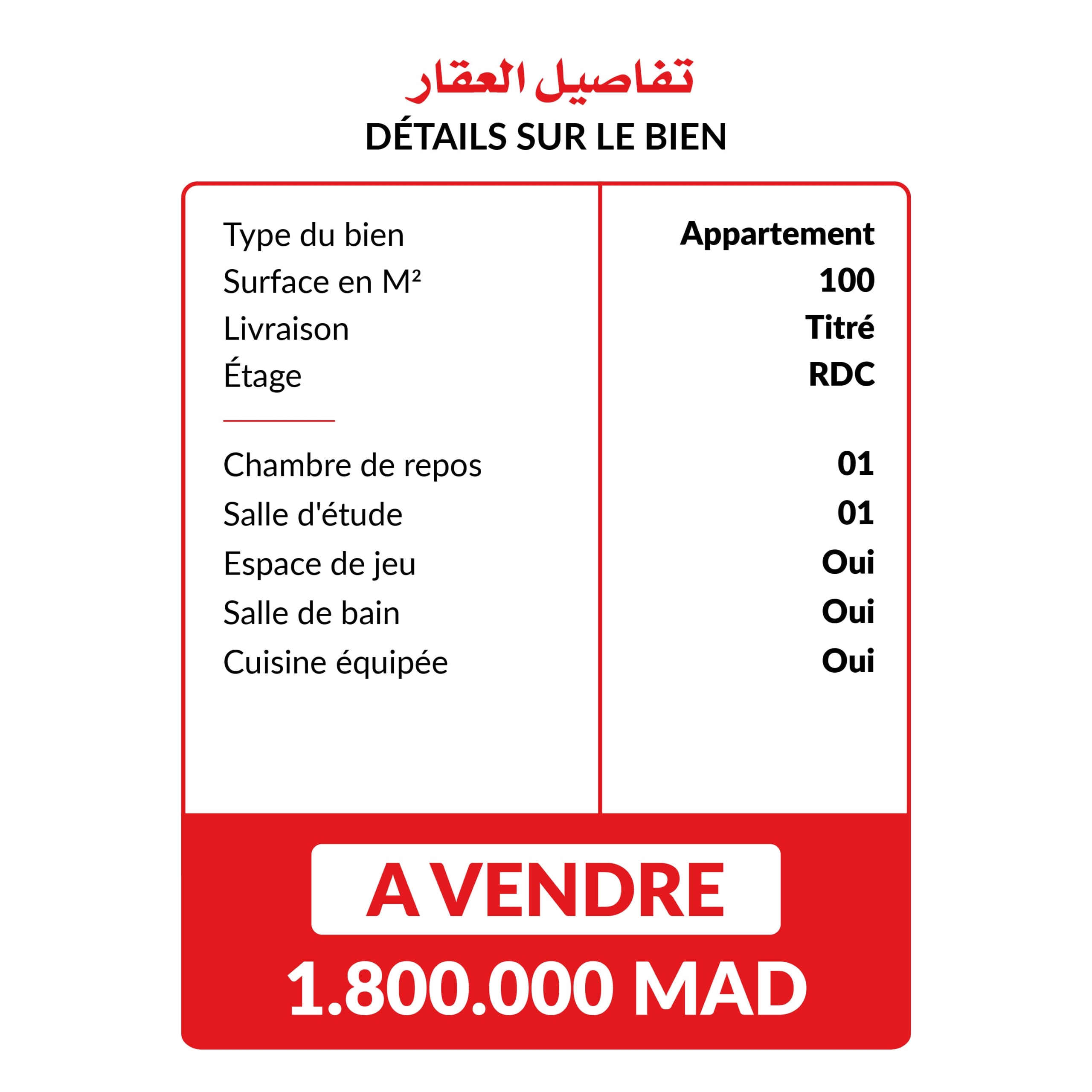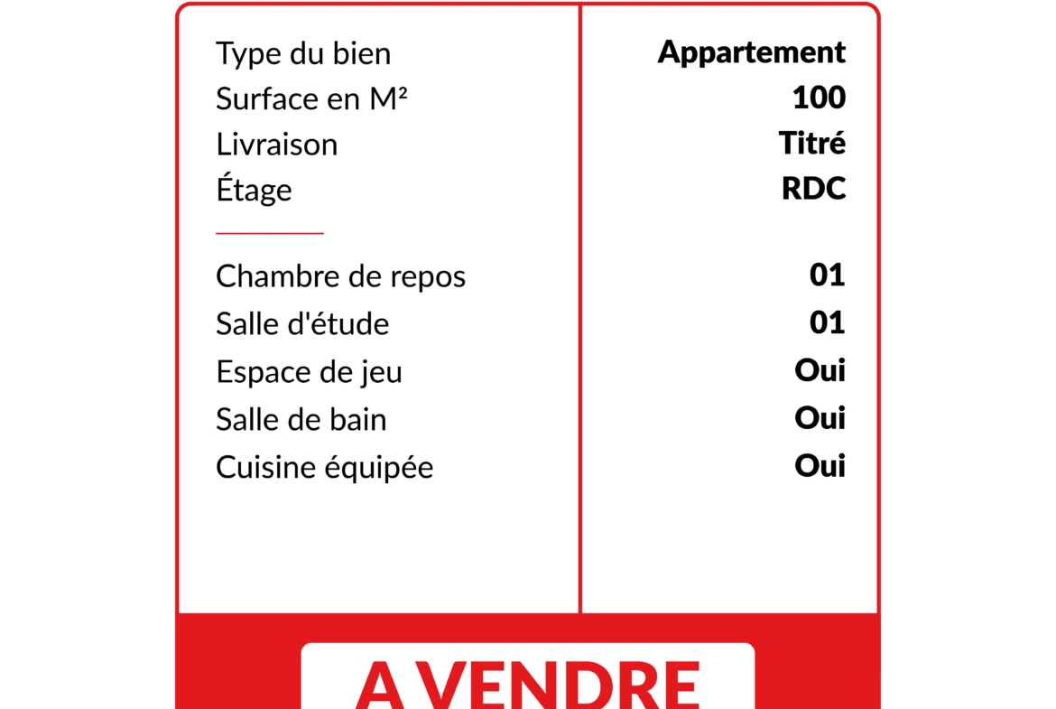 Crèche préscolaire de 100 m² situé au rez-de-chaussée avec une chambre de repos pour enfants, une salle de classe lumineuse, un espace de jeux adapté, un bureau administratif, des sanitaires pour enfants et une cuisine fonctionnelle.