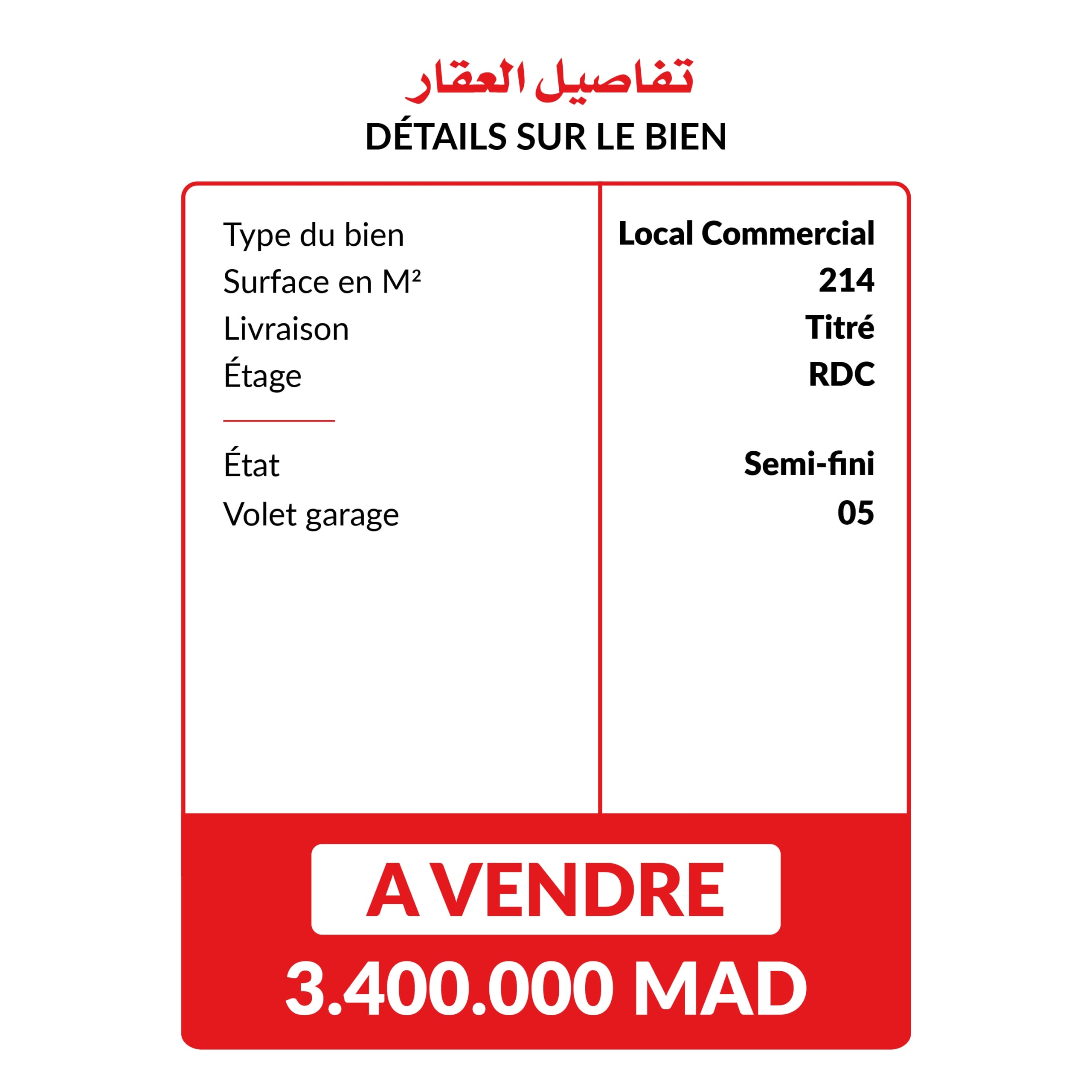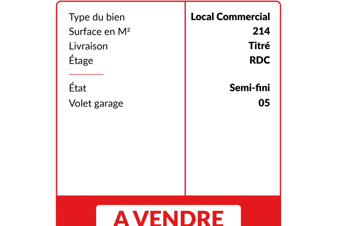 Découvrez ce superbe local commercial semi-fini avec une surface totale de 214 m², idéalement situé entre le quartier Mesnana et Marjane.
